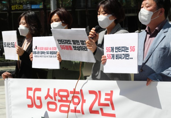 지난 4월 SK텔레콤 본사 앞에서 소비자시민모임, 참여연대 등 시민단체가 '5G 상용화 2년, 불통 보상 및 서비스 개선 촉구' 기자회견을 하고 있다.