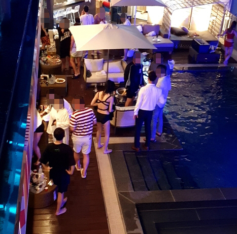 지난달 31일 저녁 강원 강릉시의 한 호텔에서 수십 명이 참가한 풀 파티가 진행되고 있다.