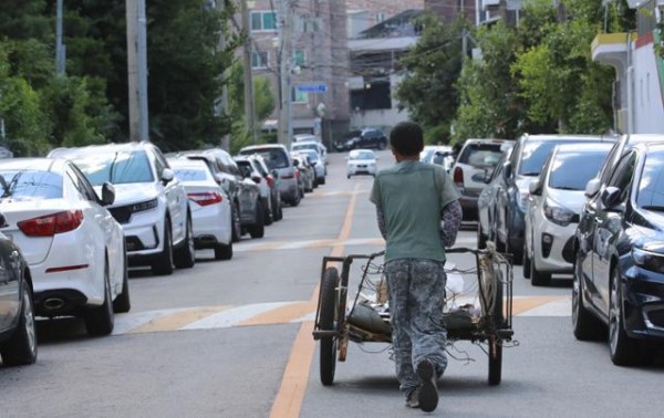 7월28일 충북 청주시 상당구에서 한 시민이 폐지를 실은 리어카를 끌고 있다. hbs 뉴스광장.