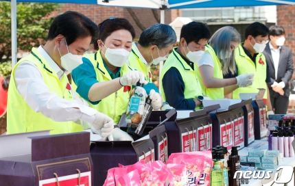 (서울=뉴스1) 안은나 기자 = 23일 서울 중구 사랑의열매 회관에서 열린 '사랑의열매 홍보대사와 함께하는 나눔컨퍼런스'에서 참석자들이 홀몸 어르신들에게 전달할 생활용품을 박스에 담고 있다. 왼쪽부터 김상균 사랑의열매 사무총장, 배우 김나운, 조흥식 회장, 이연복 셰프, 유튜버 씬, 정경식 LG생활건강 부문장. 코로나19 대국민 이웃돕기 캠페인인 '대한민국 사회백신' 나눔캠페인의 일환으로 열린 이번 행사에서 참석자들은 치약, 칫솔, 샴푸, 세제 등 생필품 26종을 담은 키트를 제작했으며 사단법인 희망을 나누는 사람들을 통해 홀몸 어르신들에게 전달한다. 2021.6.23/뉴스1