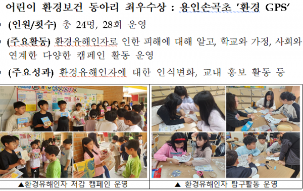 최우수상은 용인손곡초등학교의 ‘환경 지피에스(GPS)’가 받는다. 우수상 2개 팀은 공립보람더원어린이집의 ‘쓰담쓰담 수비대 2기’와