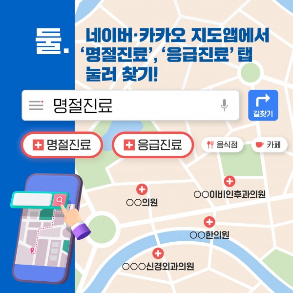 2. 네이버, 카카오, 지도앱에서 “명절진료” “응급진료” 탭을 눌러 찾기