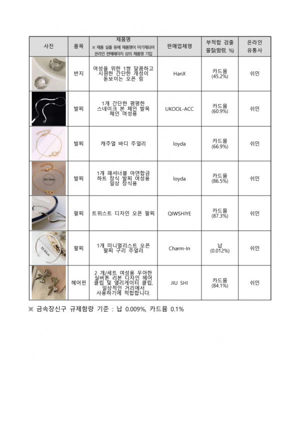 (생활화학제품 20개, 금속장신구 49개)이 ‘생활화학제품 및 살생물제의 안전관리에 관한 법률’, '화학물질등록평가법‘ 등 국내 안전기준에 적합하지