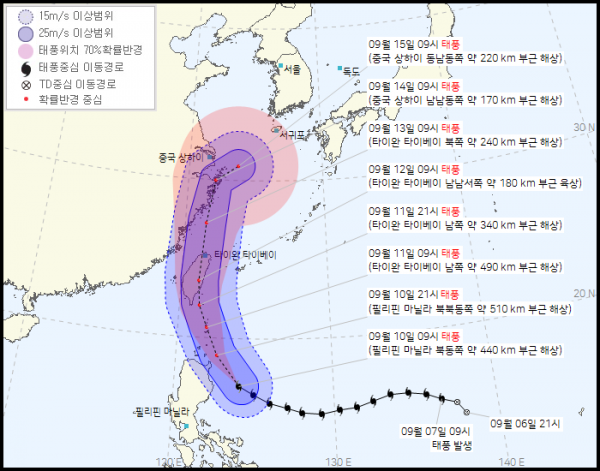 당장 다음 주말 시작되는 추석 연휴가 걱정입니다. 지금 예측대로라면 우리나라는 14일을 전후해 태풍의 영향을 받게 되기 때문입니다. 아직 태풍의 진로와 강도에 따라 '변수'는 있습니다.