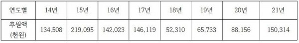 시민과 단체 등이 보내준 엄마의 밥상 지정기탁금 연도별 금액.