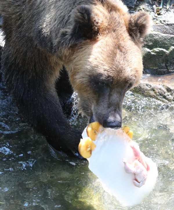 대전지역에 폭염특보가 발령되며 무더운 날씨를 보인 11일 대전 중구 오월드에서 곰이 얼음 속에 들어 있는 간식을 먹으며 더위를 식히고 있다.
