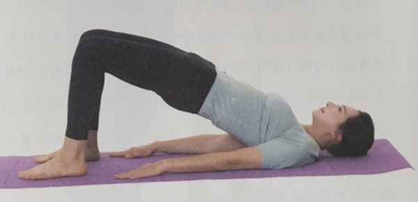 2. 허벅지에서 엉덩이, 허리가 일직선이 되도록 엉덩이를 들어올리고 10초간 유지한 후 제자리로 돌아와 5초간 휴식한다. 10회 반복한다.
