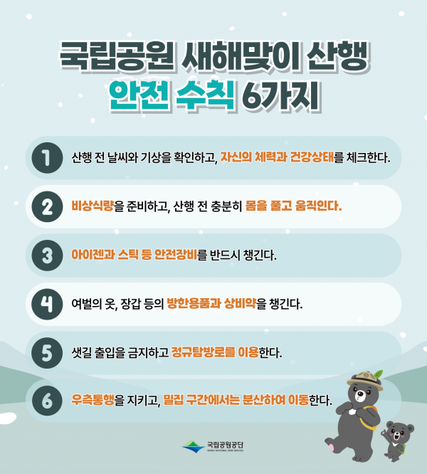 송형근 국립공원공단 이사장은 “겨울철 산행을 준비할 때는 자신의 건강 상태와 방한용품 등을 꼼꼼히 확인하고,