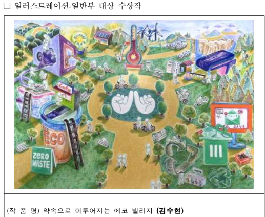 일러스트레이션 일반부 분야 대상인 ‘약속으로 이루어지는 에코 빌리지’는 다회용기 사용과 물 절약 등 환경보존을 위한 실생활 속 행동으로 환경을