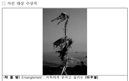 올해 공모전 대상에는 △사진 분야에서 ‘엔탱글먼트(Entanglement) : 지독하게 얽히고 설키는(이우열 작)’이, △정크아트 분야에서 ‘알바트로스가
