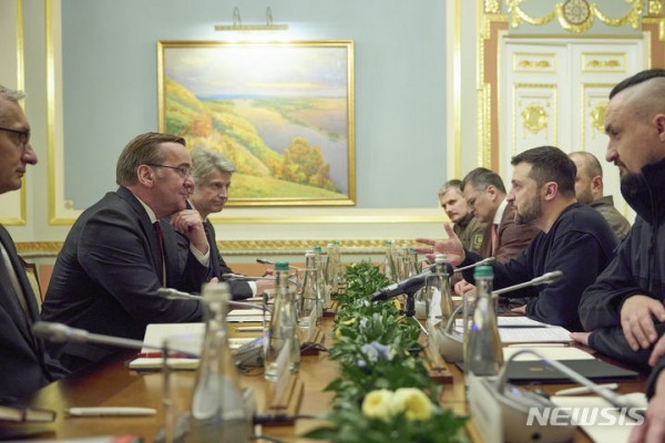 볼로디미르 젤렌스키(오른쪽) 우크라이나 대통령이 21일(현지시각) 키이우에서 보리스 피스토리우스 독일 국방장관과 회담하고 있다. 피스토리우스 장관은 예고 없이 키이우를 방문해 우크라이나에 대한 변함 없는 지원을 밝혔다.