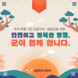 추석 명절 기간 동안 (9월 13일~18일) 동안 긴급구조 및 응급진료를 지원한다. 구조장비 (응급차량, 응급헬기) 구조 지원병력 3,200여명, 전국 군병원12 곳이 지원을 한다. 의료종합상황센타 1668 - 5119 국방부는 안전한 추석 연휴를 위해 국민의 곁에서 최선의 노력을 다하겠다고 했다.