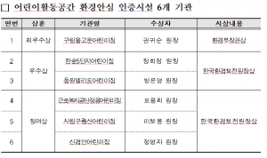 ▷ 어린이 환경보건 동아리 6개 팀, 어린이활동공간 환경안심 인증 시설 6개 기관 수상 환경부(장관 김완섭)는 12월 6일 스페이스에이드시비디(서울 중구 소재)에서 ‘2024년 어린이 환경보건 활동 우수기관 시상식 및 성과발표회’를 개최한다. 이번 시상식에서는 교내에서 환경보건 인식 확산에 힘쓴 ‘어린이 환경보건 동아리’ 6개 팀과 어린이활동공간을 우수하게 관리한 ‘어린이활동공간 환경안심 인증 시설’ 6개 기관이 수상한다. 시상식에 이어 이들 수상 기관이 성과발표회를 가지며, 우수사례집과 발표 영상이 누리집(eco-playg…